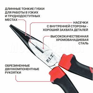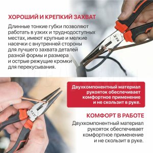 Длинные тонкие губки позволяют работать в узких и труднодоступных местах, имеют крупные и мелкие насечки с внутренней стороны для лучшего захвата деталей разной формы и размера и острые режущие кромки для перекусывания.