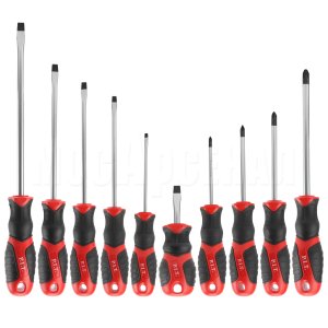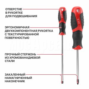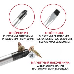 Стержень отверток выполнен из прочной хромованадиевой стали, стойкой к нагрузкам и коррозии, с закаленным намагниченным наконечником.