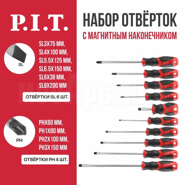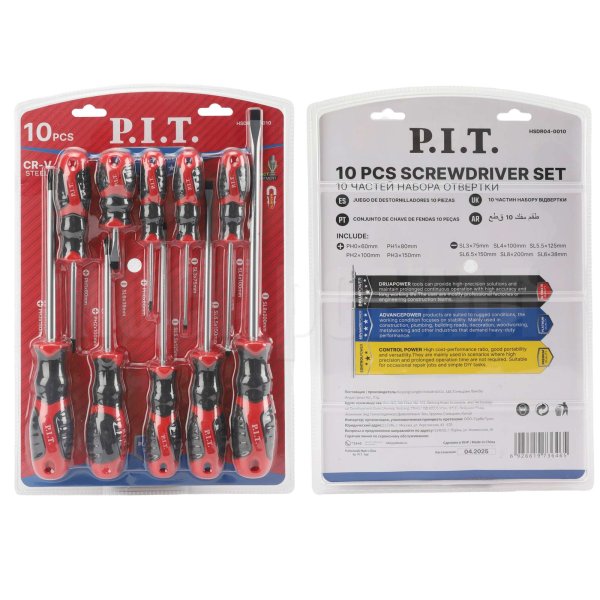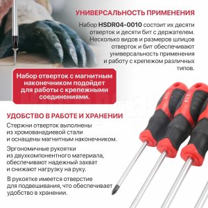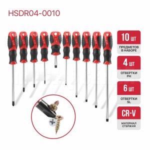 Набор отверток с магнитным наконечником HSDR04-0010 предназначен для монтажа и демонтажа крепежа с крестообразным и плоским шлицем PH и SL различного размера.