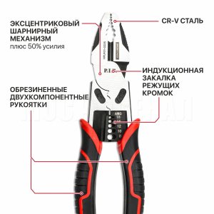 Конструкция шарнирного механизма с эксцентриком обеспечивает увеличенную до 50% передачу усилия на рабочую часть инструмента. Благодаря этому перекусывание кабеля или металлического прутка большого диаметра не требует приложения больших усилий.