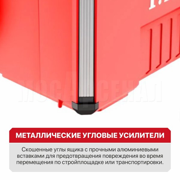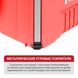 Скошенные углы ящика с прочными алюминиевыми вставками для предотвращения повреждения во время перемещения по стройплощадке или транспортировки.