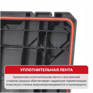 Кромочная уплотнительная лента с внутренней стороны крышки обеспечивает надежную герметизацию и высокую степень водонепроницаемости и пылезащиты.