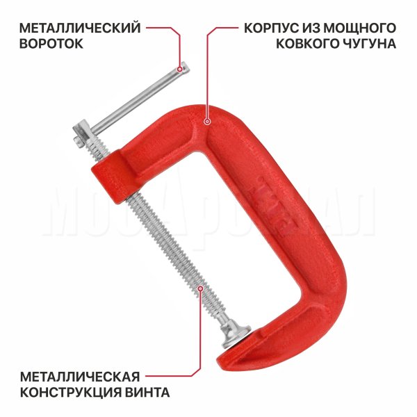 Винтовая конструкция и G-образный корпус позволяют фиксировать заготовки различных размеров и формы